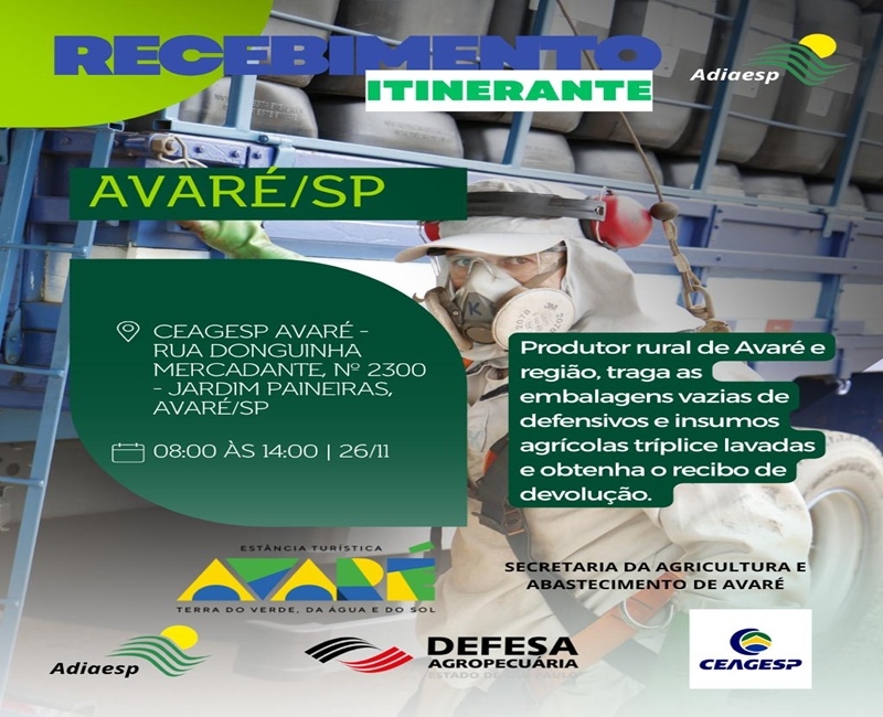 Fonte da Foto: Reprodução cartaz do eventoUma oportunidade para produtores rurais de Avaré e região. A estância turística recebe no dia 26 de novembro um ponto itinerante para recolhimento de embalagens vazias de defensivos agrícolas.
