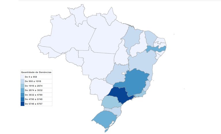 Entre os estados, São Paulo continua liderando o ranking, com 6.702 denúncias, Minas Gerais aparece em segundo, com 4.145, e o Rio Grande do Sul em terceiro, com 3.453. Por outro lado, as unidades da Federação que menos registraram relatos foram Roraima (23), Amapá (48) e Tocantins (98).