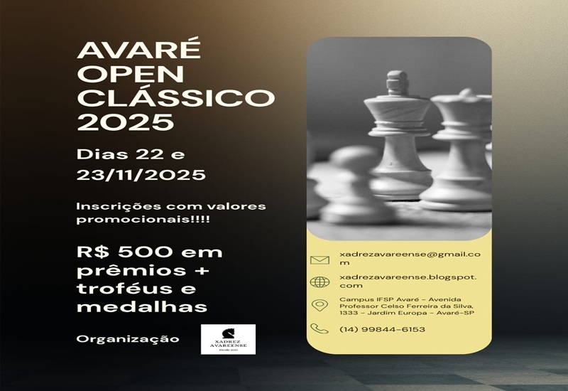 Nos dias 22 e 23 de novembro de 2025, Avaré será palco do Avaré Open de Xadrez Clássico, evento organizado pelo Xadrez Avareense com apoio do Instituto Federal de São Paulo – Campus Avaré, onde as partidas serão disputadas.