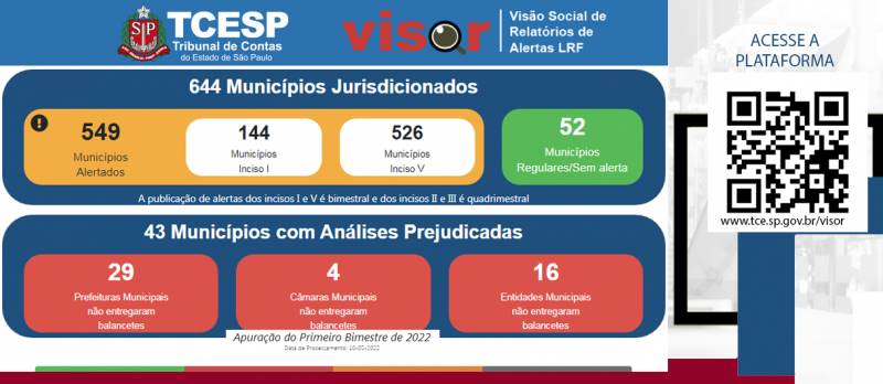 Os dados, detalhados por município, estão disponíveis para consulta e download na plataforma VISOR (Visão Social de Relatórios de Alertas), no site do TCE, acessível pelo link www.tce.sp.gov.br/visor.