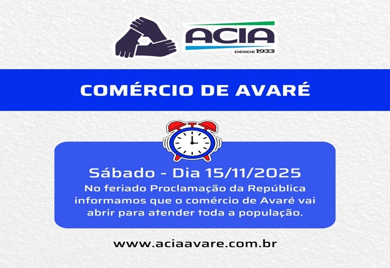 Fonte da Foto: AssessoriaA Associação Comercial, Industrial e Agropecuária de Avaré (ACIA) informa que neste sábado, 15 de novembro, feriado da Proclamação da República, o comércio avareense estará atendendo normalmente.