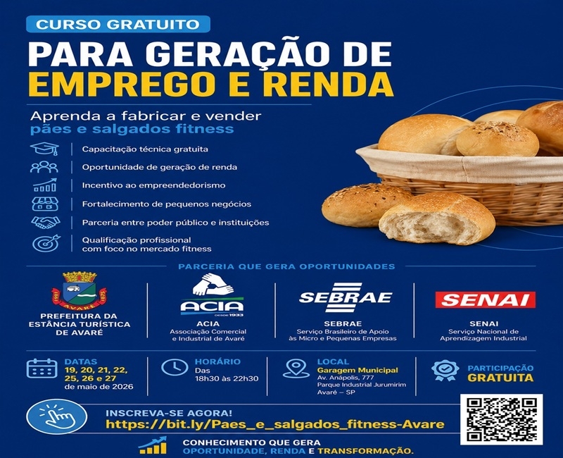 Fonte da Foto: Reprodução cartaz do eventoA qualificação profissional continua sendo uma das principais portas de entrada para o mercado de trabalho e também uma oportunidade real de geração de renda para muitas famílias. Com isso, a Prefeitura da Estância Turística de Avaré oferece mais um curso técnico gratuito: “Aprenda a fabricar e vender pães e salgados fitness”, iniciativa voltada ao fortalecimento do empreendedorismo e à criação de novas oportunidades de trabalho.