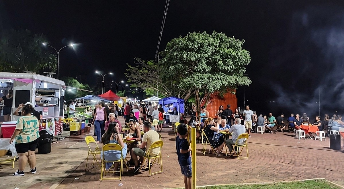 legenda: Evento, que acontece das 18h às 23h, conta com barracas de alimentação e artesanato, além de brinquedos infláveis para crianças