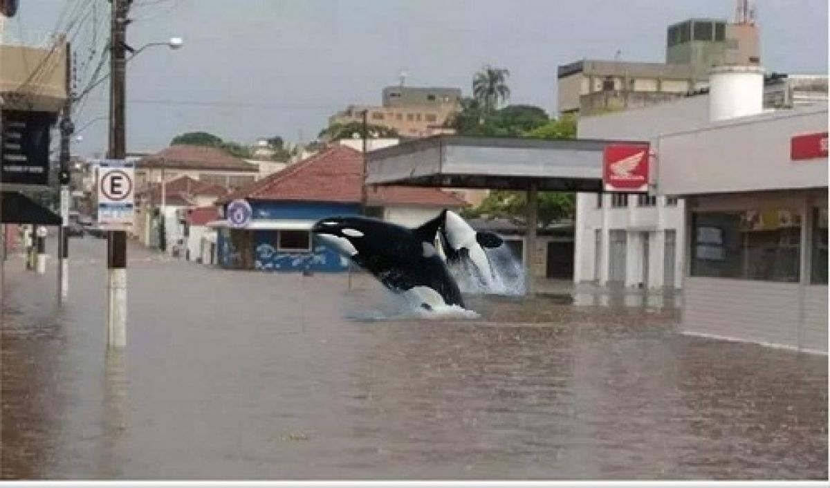 Outra imagem traz duas baleias orcas emergindo das águas da enchente. Outra foto traz a imagem da Arca de Noé com os dizeres: “Aviso a todos. A arca sairá hoje às 18h de frente a matriz”.