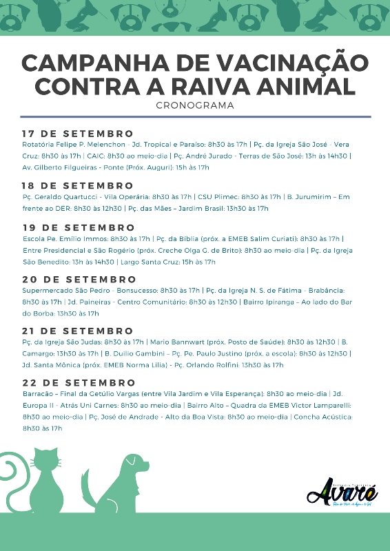 Fonte da Foto: Jarbas RochaA Prefeitura de Avaré, por meio da Vigilância Sanitária (VISA), vai promover entre os dias 17 e 22 de setembro, a Campanha Nacional de Vacinação contra a Raiva Animal. Nesta primeira fase, a imunização acontecerá na zona urbana, conforme cronograma divulgado pelo departamento (foto), com horários que variam entre as 8h e às 17h..jpg)