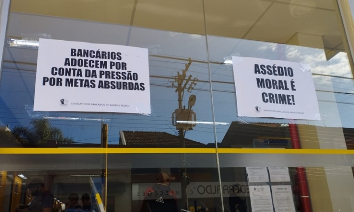 Cartazes com dizeres “Bancários adoecem por conta da pressão por metas absurdas” e “Assédio Moral é crime” foram afixados nas portas de vidro da agência.