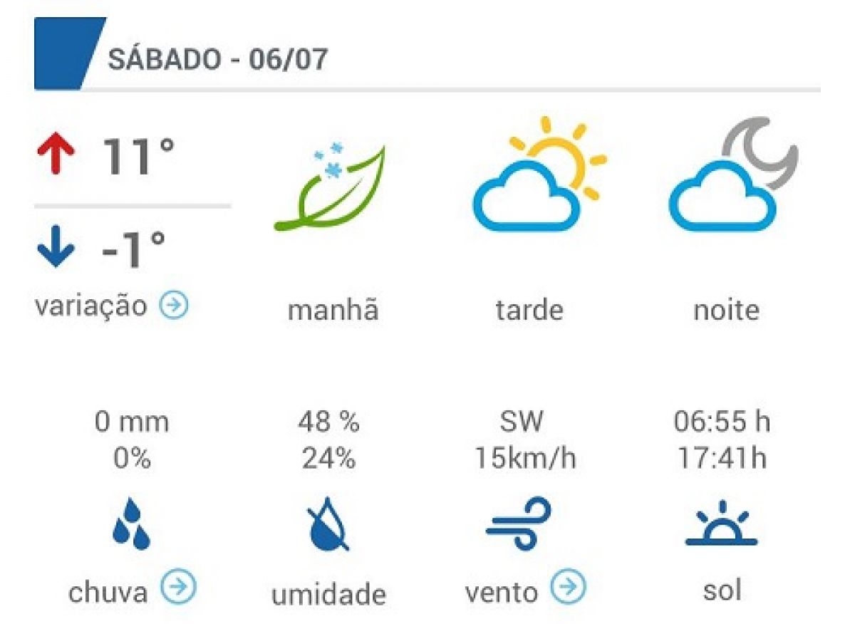 Segundo estimativa do Climatempo, o próximo sábado, dia 06, poderá ter temperatura mínima abaixo de zero, apontando -1 grau e geada durante a madrugada. A máxima desse dia será de 11 graus com o aparecimento do sol.