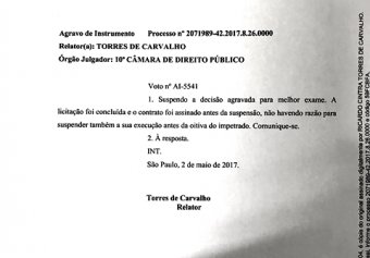 O Desembargador acolheu os argumentos da Procuradoria Jurídica do Município alegando que a suspensão do serviço era desnecessária pois a Licitação foi concluída e o contrato assinado ANTES da suspensão da justiça local, não havendo, portanto, razões para sua manutenção sem que a Prefeitura de Avaré fosse ouvida nos autos do Mandado de Segurança impetrado pela empresa descontente com a decisão do Departamento de Licitações em desclassificá-la.