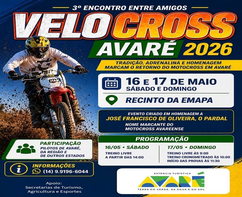 Fonte da Foto: Reprodução cartaz do eventoA paixão pelo motocross, a amizade entre pilotos e a vontade de manter viva uma história que marcou gerações deram origem ao 3º Encontro Entre Amigos Velocross Avaré 2026, que será realizado nos dias 16 e 17 de maio, sábado e domingo, no recinto da EMAPA.