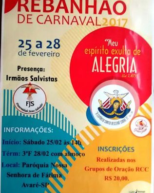 Serão quatro dias de atividades com início no sábado, 25, a partir das 14h e término na terça-feira de Carnaval (28), com um almoço aos participantes. Na programação do Rebanhão consta a presença dos Irmãos Salvistas, do Instituto Missionário Servos de Jesus Salvador, com sede na cidade de São Paulo.